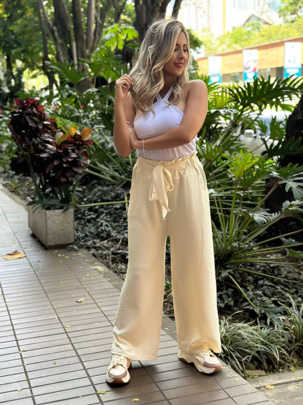PANTALÓN BOTA ANCHA PRETINA CORRUGADA MARFIL